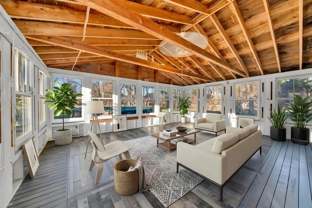 Minutes to downtown Amesbury's charming anda thriving community, this classic farm-style single family sits on an oversized, meticulously landscaped lot w/ a level backyard offering privacy and room to expand, garden, or entertain. Owned solar adds efficiency and long-term savings, while the expansive detached garage has workshop potential and sprinkled updates maintain the antique feel with a dash of modern finishes.Inside, the main level offers a 1/2 ba, kitchen, and open flow between dining/living areas w/ fireplace and timeless New England charm, ideal for both daily living and hosting. Off the kitchen, a sun-filled 3-season room overlooks...read more