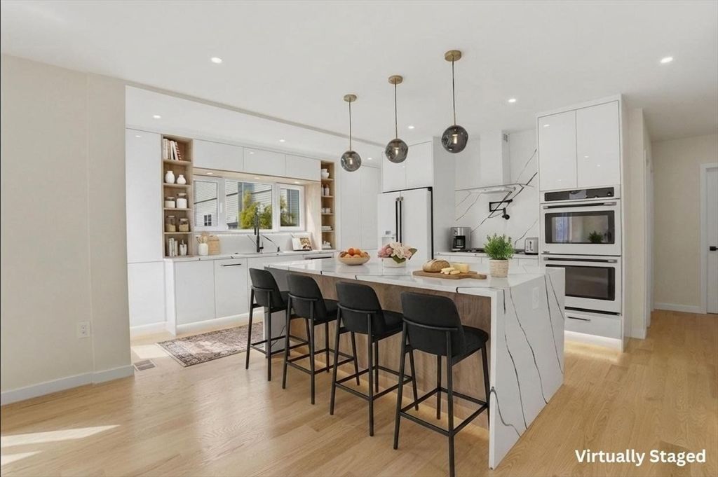 BEAUTIFULLY RENOVATED first-level home offering refined single-level living with modern finishes and exceptional natural light throughout. The open-concept living and dining space is bright and inviting, featuring a fireplace and oversized windows, flowing into a thoughtfully designed kitchen with a large center island, stone surfaces, custom cabinetry, and premium appliances - ideal for everyday living and effortless entertaining. The primary suite features a sleek full bath, while two additional bedrooms offer flexibility for guests, a home office, or a tailored lifestyle. Additional highlights include hardwood floors, central air, in-unit...read more